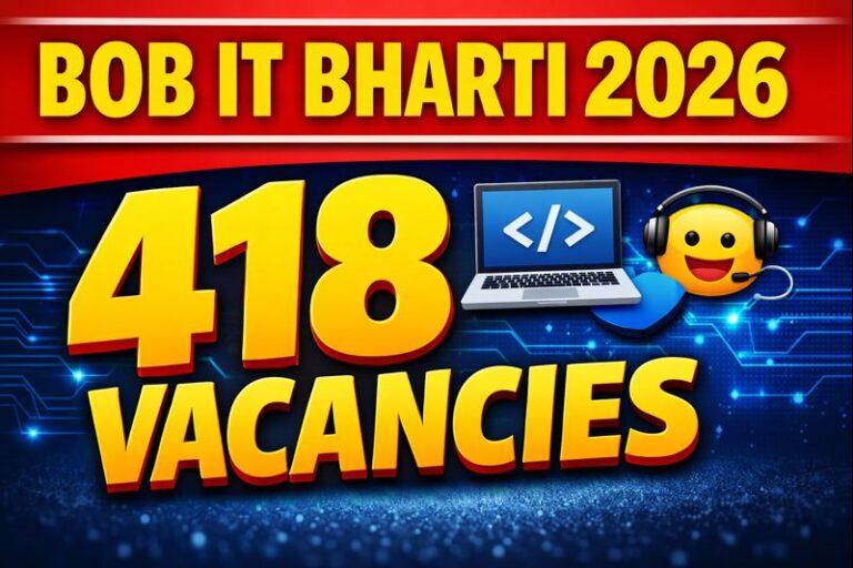 Bank of Baroda (BOB) ने Information Technology (IT) Department में 418 Regular Vacancies की बड़ी भर्ती निकाली है। इस भर्ती में Full Stack Developer (Java/MERN), Cloud Engineer, AI Engineer, Data Scientist, Data Engineer, Network Administrator, Database Administrator, Finacle Developer, API Developer, Mobile App Developer सहित कई पद शामिल हैं। इच्छुक और योग्य उम्मीदवार 30 जनवरी 2026 से 19 फरवरी 2026 तक ऑनलाइन आवेदन कर सकते हैं। चयन पूरे भारत में पोस्टिंग के लिए होगा।