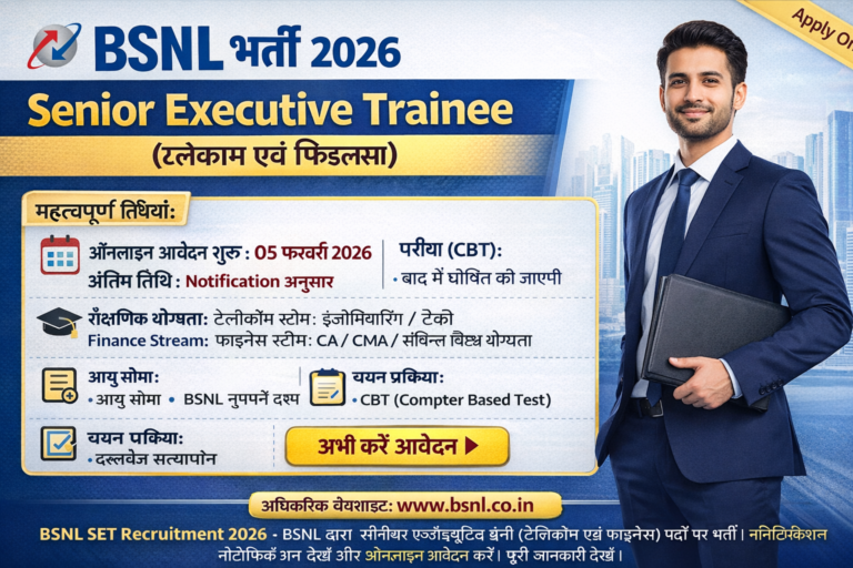 BSNL Recruitment 2026 के तहत Senior Executive Trainee (Telecom एवं Finance) पदों पर भर्ती का नोटिफिकेशन जारी। पात्र उम्मीदवार ऑनलाइन आवेदन करें और पूरी जानकारी देखें।