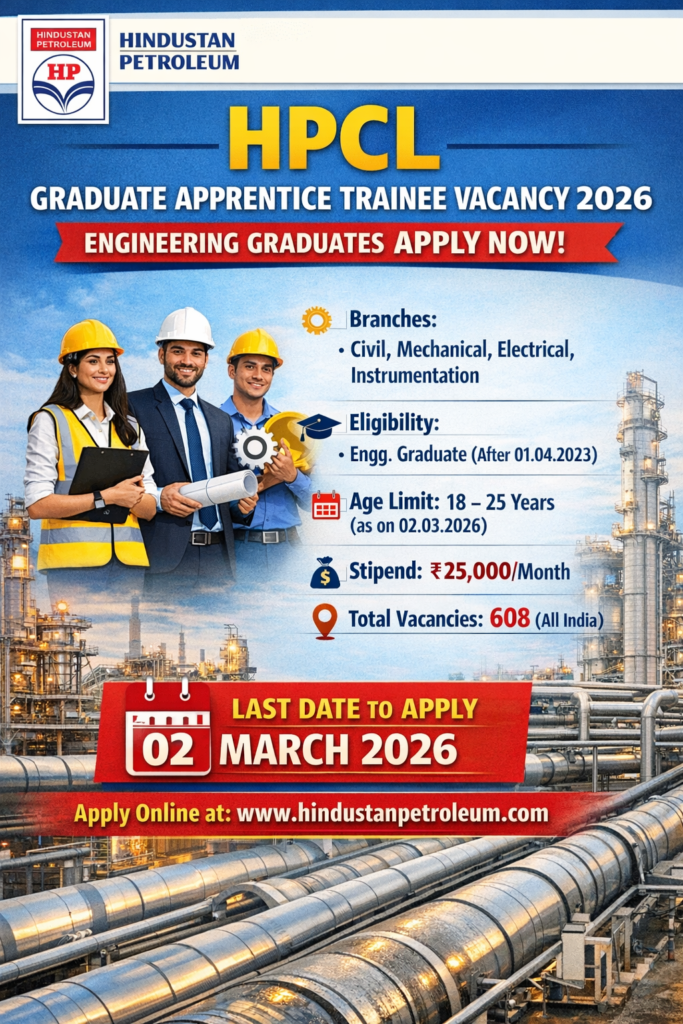 Hindustan Petroleum Corporation Limited (HPCL) invites applications for Graduate Apprentice Trainees (Engineering) under the Apprentices Act, 1961.